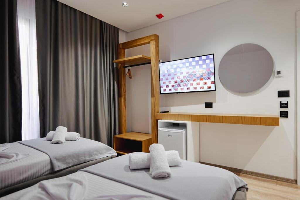 Hotel ima ukupno 40 soba, uključujući standardne sobe za 2-4 osobe i delux sobe za parove. Svaka soba ima balkon, klimu, TV, mini frižider, garderober i sopstveno kupatilo sa tuš kabinom i peškirima. Gotovo sve sobe imaju prekrasan pogled na Jonsko more.